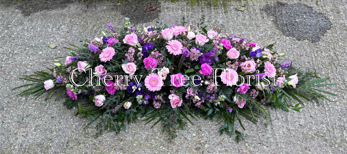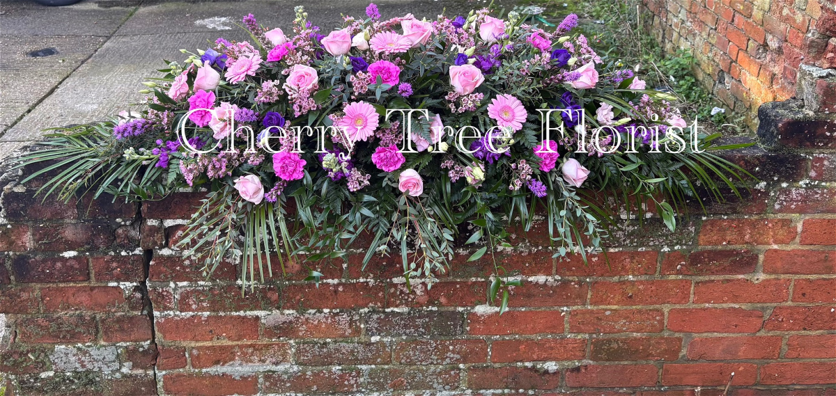 This gorgeous coffin spray consists of a mixture of Pink and Purple flowers and lush Green polished foliage with the addition of some trailing foliage