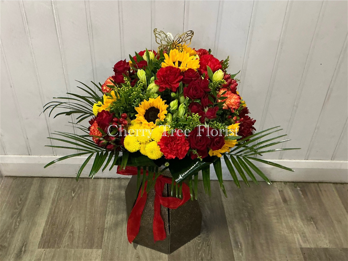 The Prestige Bouquets are beautiful hand-tied bouquets.  All flowers and foliages used are of the best quality. This bouquet will consist of a variety of florist choice flowers such as roses, Carnations, Alstromeria, Chrysanthemums, Gerberas, etc.